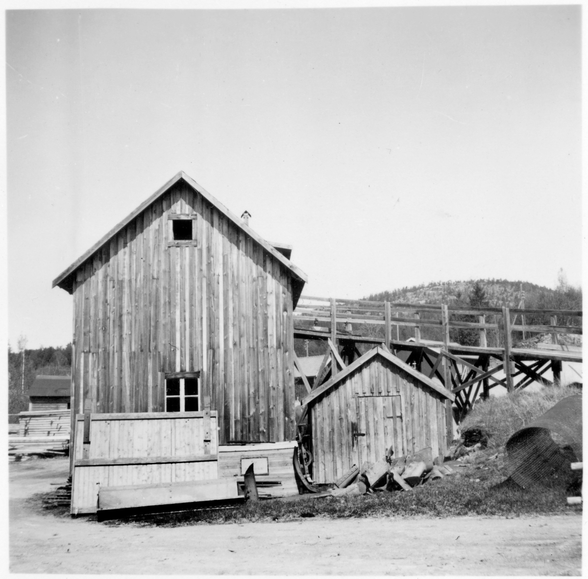 Vägstation Y9, Själevad. Förrådsbyggnad i två våningar med uppfartsramp till övre våningen.