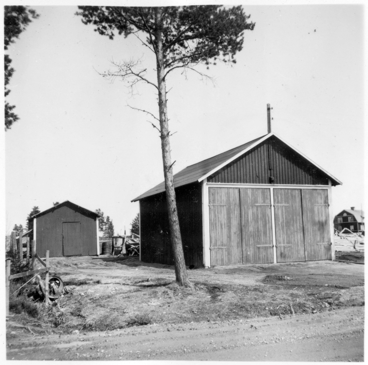 Vägstation Y9, Själevad, filial Hemling. Garagebyggnad, i bakgrunden förrådsbyggnad och bostadshus. Invid väg.