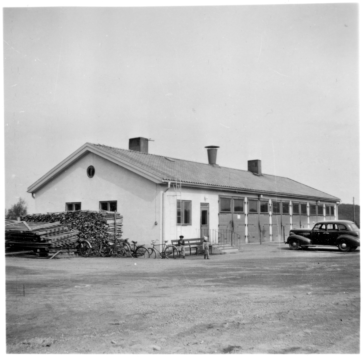 Vägstation Y12, Sollefteå. Vägstationens huvudbyggnad med kontor och garage. På bänk framför byggnaden två barn. Personbil på garageplan. Vid gaveln upplag av fasta snöskärmar, så kallade flakskärmar. Cyklar och vedupplag vid gaveln.