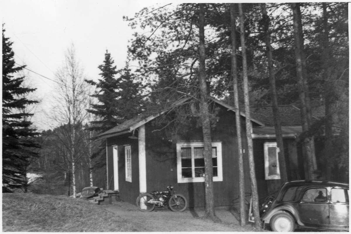 Vägstation Y12, Sollefteå, filial färjeläget Multrå. Färjvaktarens bostad. Personbil och cykel vid byggnaden.