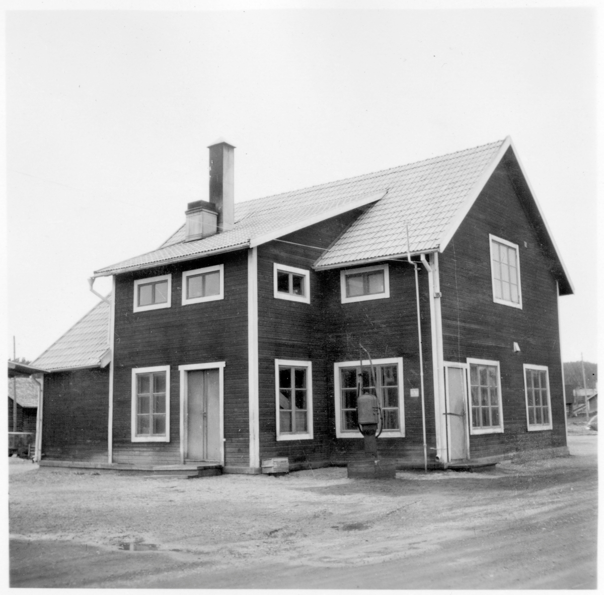 Vägstation Y13, Bredbyn. Kontors- och eventuell förrådsbyggnad i före detta bostadshus eller fabriksbyggnad. Bensinpump (drivmedelspump) framför byggnaden.