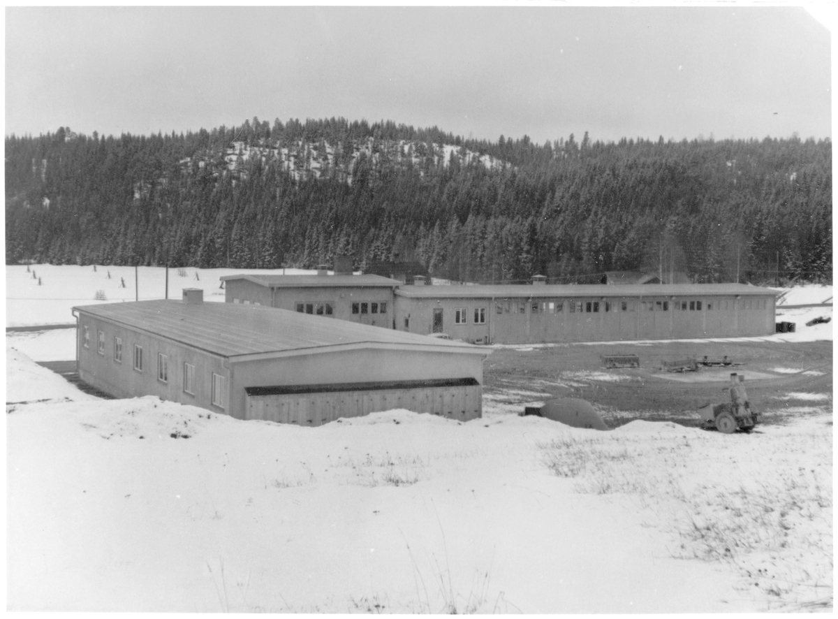 Vägstation Y13, Bredbyn. Vy över vägstationen med förrådsbyggnad och huvudlängan med verkstad, kontor och garage. På garageplan sandspridare och ångpanna, trumtiningsaggregat. Vid förrådsbyggnaden manskapsskåp för manskapets personliga utrustning och redskap.