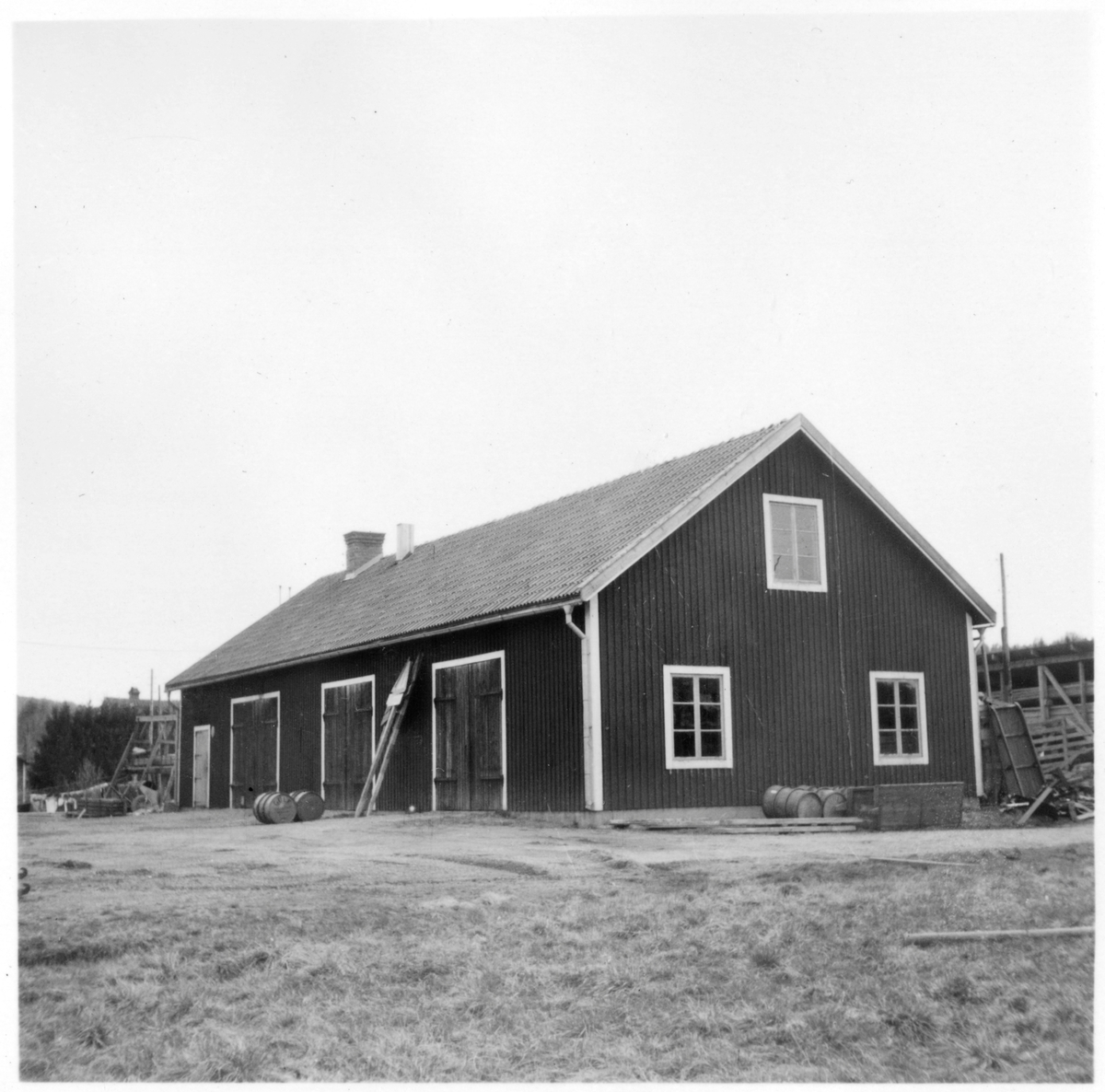 Vägstation Y13, Bredbyn. Garage- och förrådsbyggnad. Vägmärken lutade mot byggnaden.