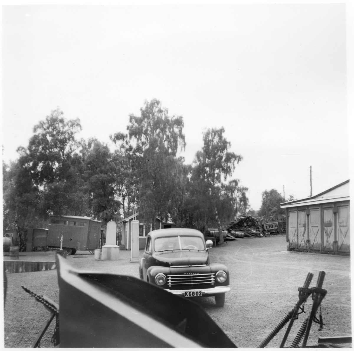 Vägstation K2, Gärestad. Garageplan med garagebyggnad till höger. Spetsplog i förgrunden. Manskapsvagn ÅSA transportabla manskapsbod, Åmåls Sågverks AB. Personbil Volvo PV K6802.