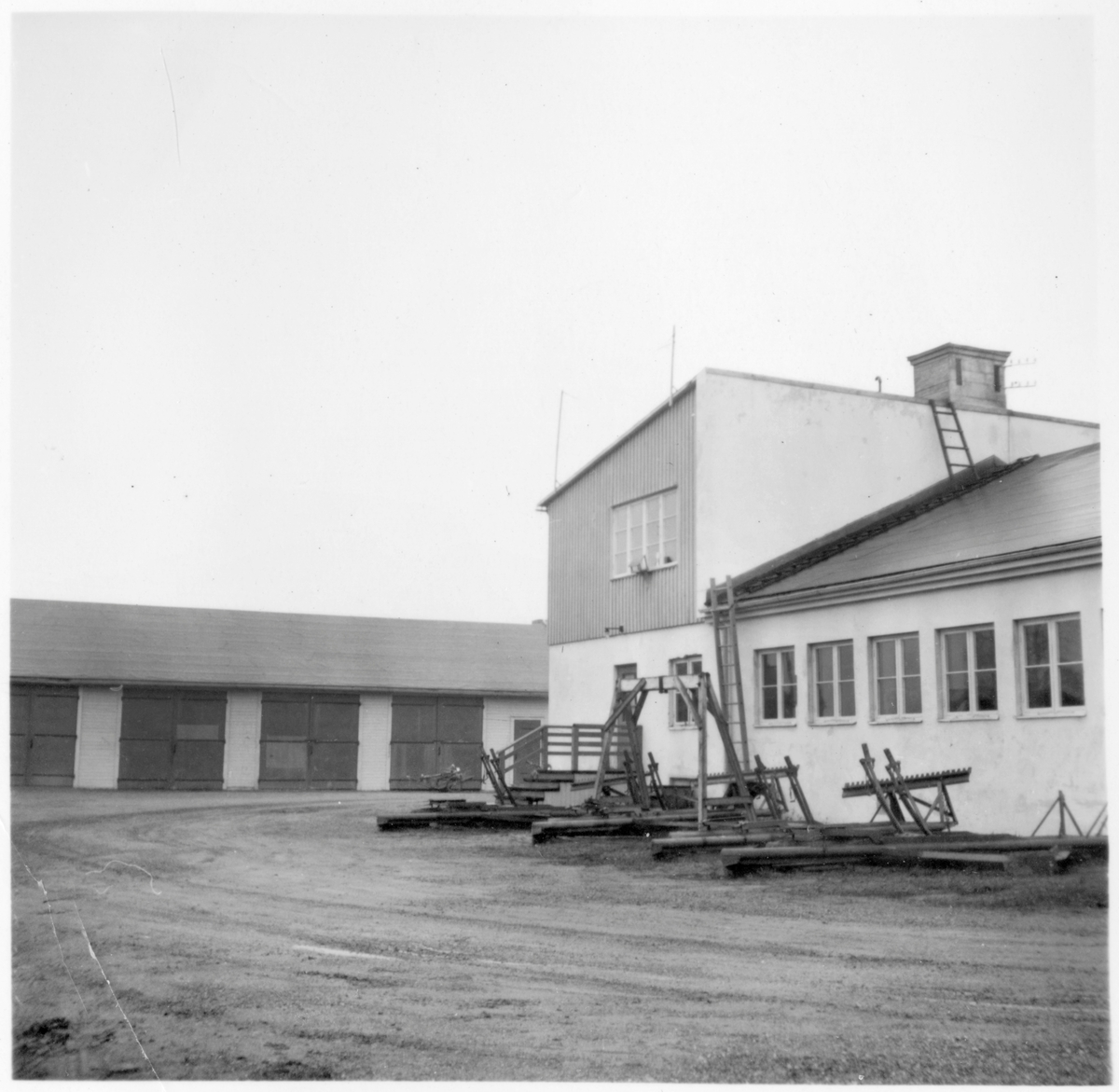 Vägstation BD1, Öjebyn. Verkstads- och garagebyggnaden till höger. Förrådsbyggnad, eventuellt äldre garagebyggnad i bakgrunden. Vägsladdar framför garagebyggnaden.