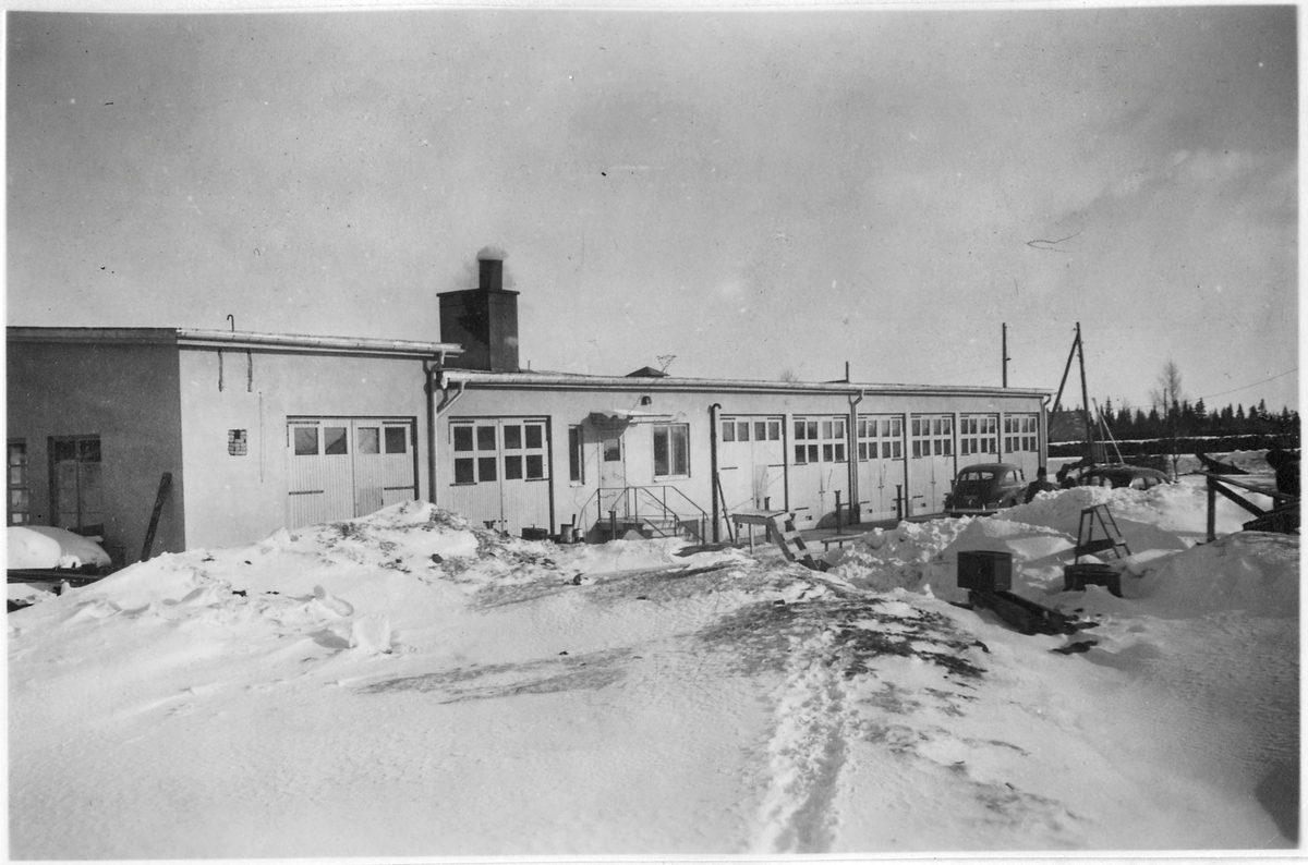 Vägstation BD9, Haparanda. Vägstationens huvudbyggnad med verkstad, kontor, garage. Personbilar på garageplan (vinterbild).