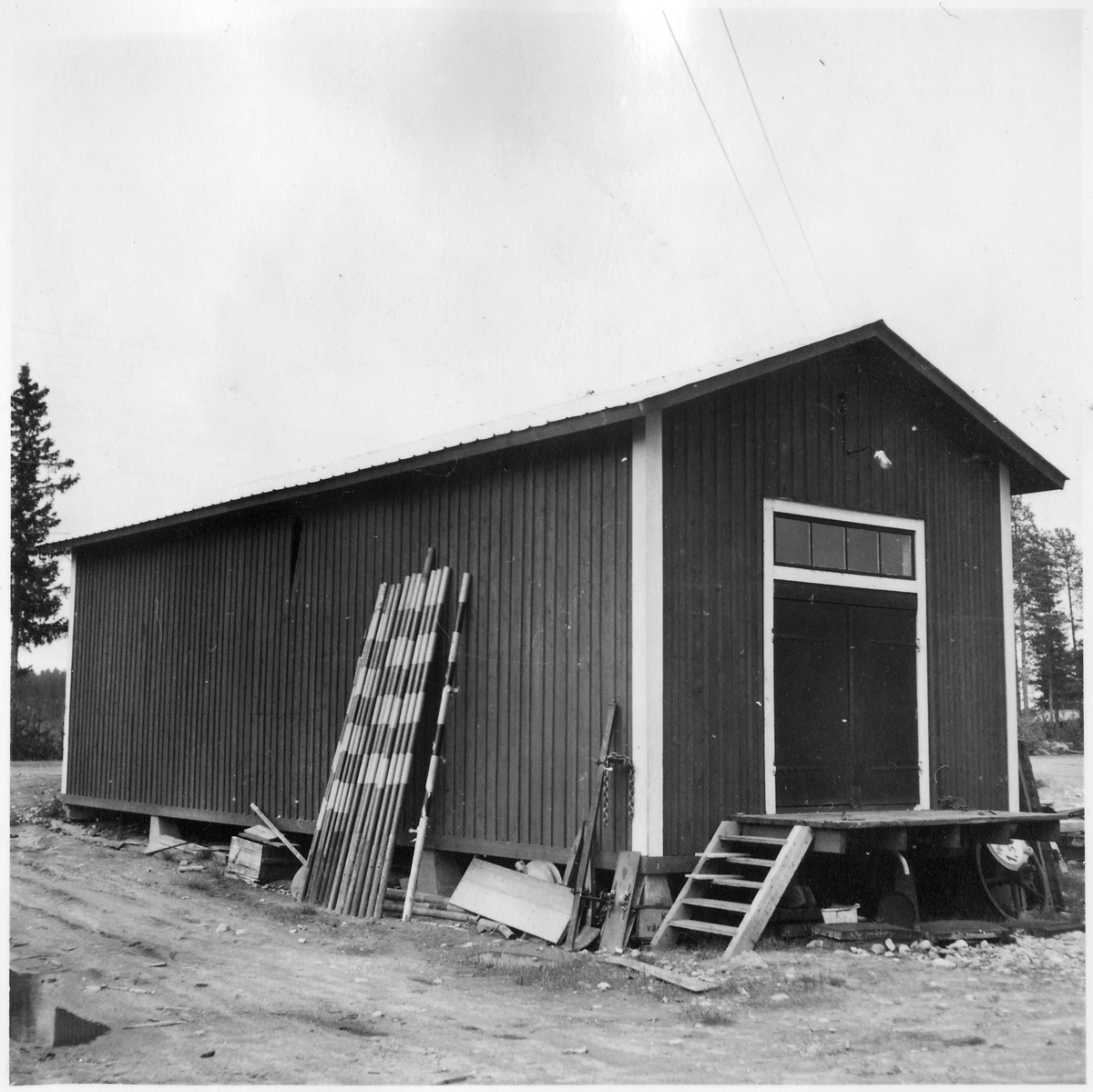 Vägstation BD8, Överkalix. Förrådsbyggnad med lastkaj. Stolpar till vägmärken lutade mot byggnaden.