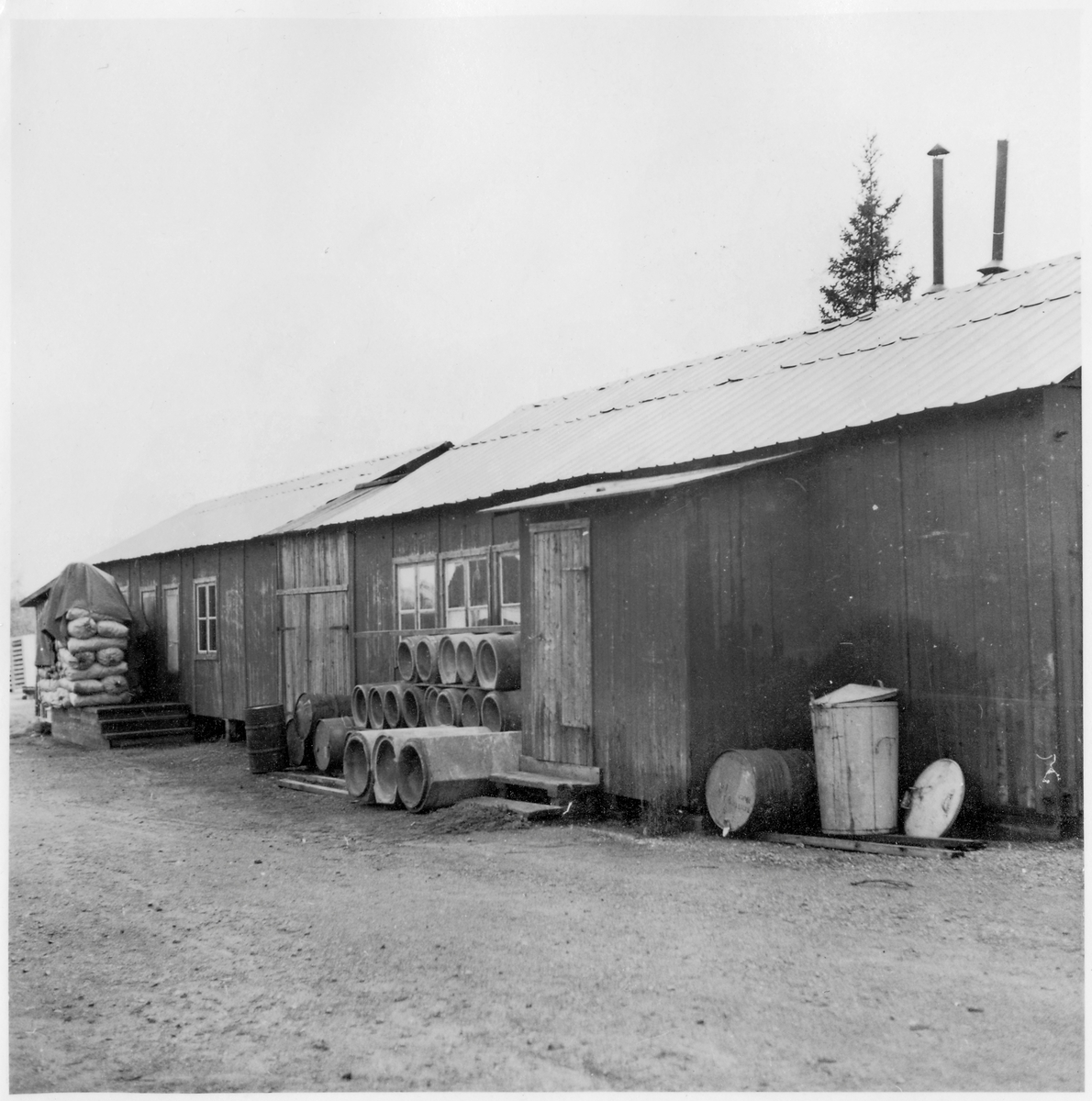 Vägstation BD9, Haparanda. Förrådsbyggnader. Upplag av diverse materiel, bland annat cementrör.