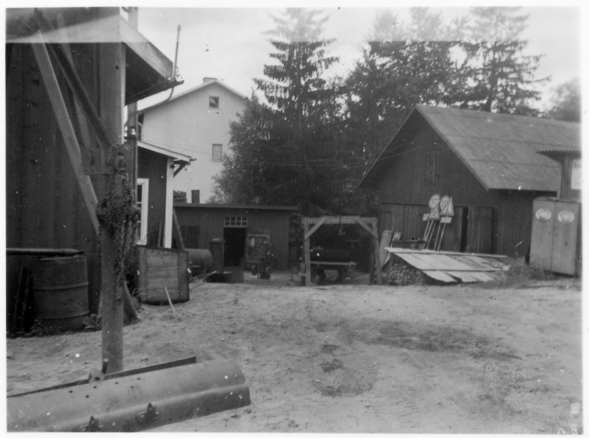 Vägstation W7, Svärdsjö. Olika förrådsbyggnader. I förgrunden vinsch med handdrivet kättingspel. Mot förrådsbyggnad ett antal vägmärken.