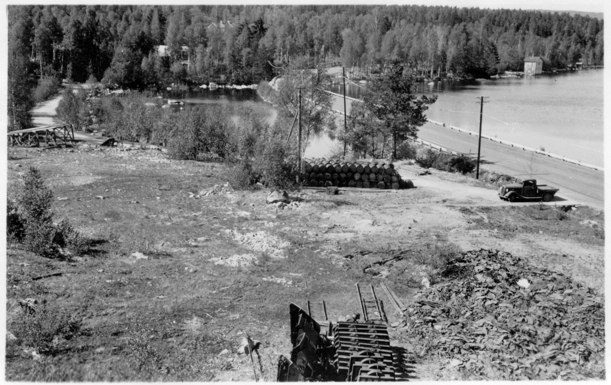 Vägstation W 6, Falun, filial Bäckehagen. Upplagsplats för diverse material, bland annat bränslefat, liten lastbil (paketbil) vid infarten. Invid väg W294 (senare riksväg 80) vid sjön Varpan. Bergsmansgården Bäckehagens badhus vid stranden av Varpan.