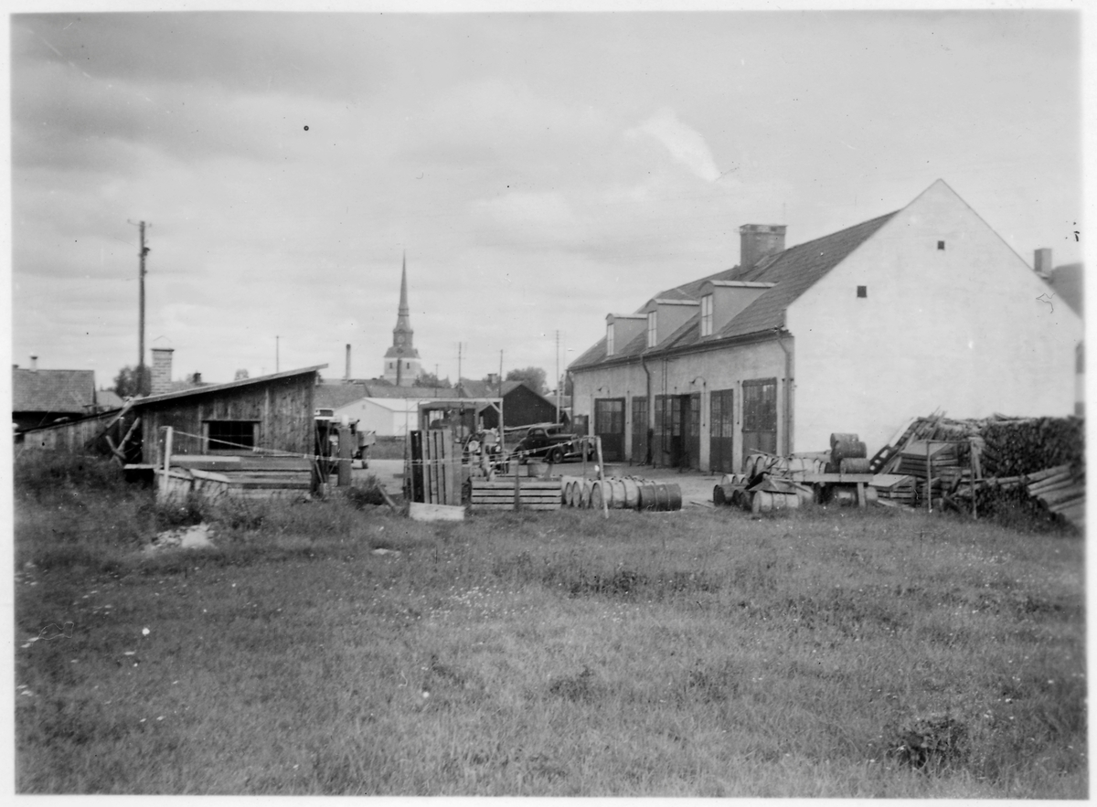 Vägstation W11, Mora. Garagebyggnad och förrådsbyggnader. Upplag av diverse material, "skrot", runt byggnaden, bränslefat, vedupplag. Personbil på garageplan. Mora kyrka i bakgrunden.