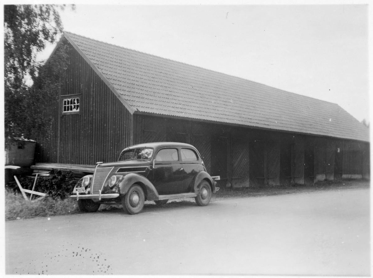 Vägstation W11, Mora. Förrådsbyggnad, eventuellt äldre garagebyggnad. Personbil W3576 framför byggnaden. Invid väg.