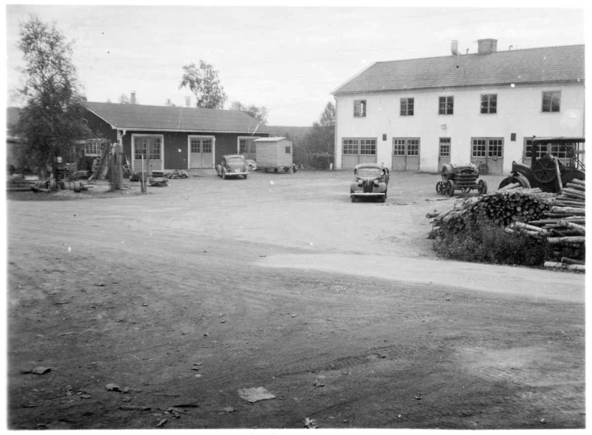 Vägstation W13, Älvdalen. Garagebyggnad i två våningar. Kontor eller eventuellt bostäder i övervåningen. På garageplan stenkross, Arbrå, och motorvält, Munktell. Två personbilar. Till vänster förrådsbyggnad. Manskapsvagn framför byggnaden. Bensinpump (drivmedelspump). Upplag av ved.