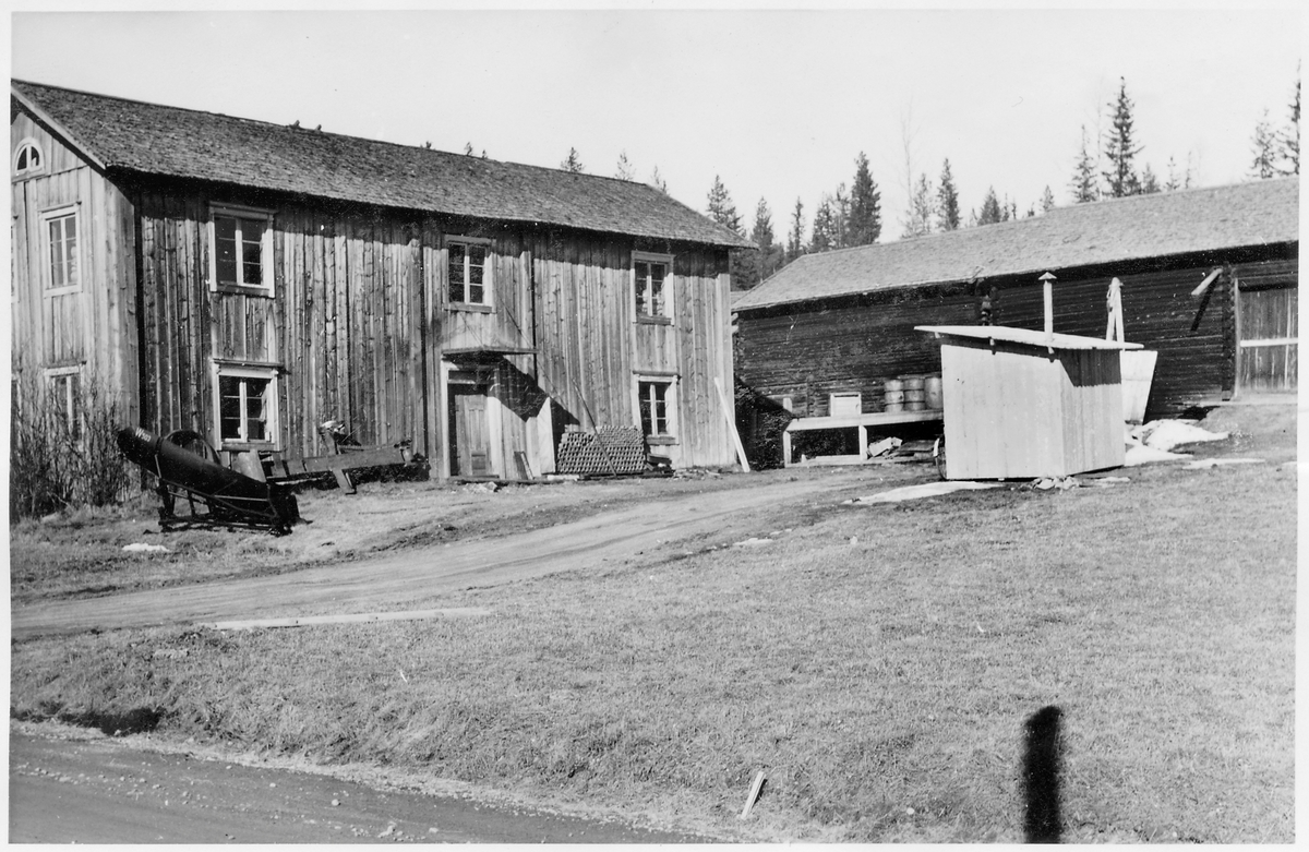 Vägstation W14, Transtrand. Äldre mangårdsbyggnad i två våningar. Troligen vägstationens kontor. Förrådsbyggnader, gamla ekonomibyggnader till bondgård. På gårdsplanen sidoplog W503, upplag av täckdikningsrör.