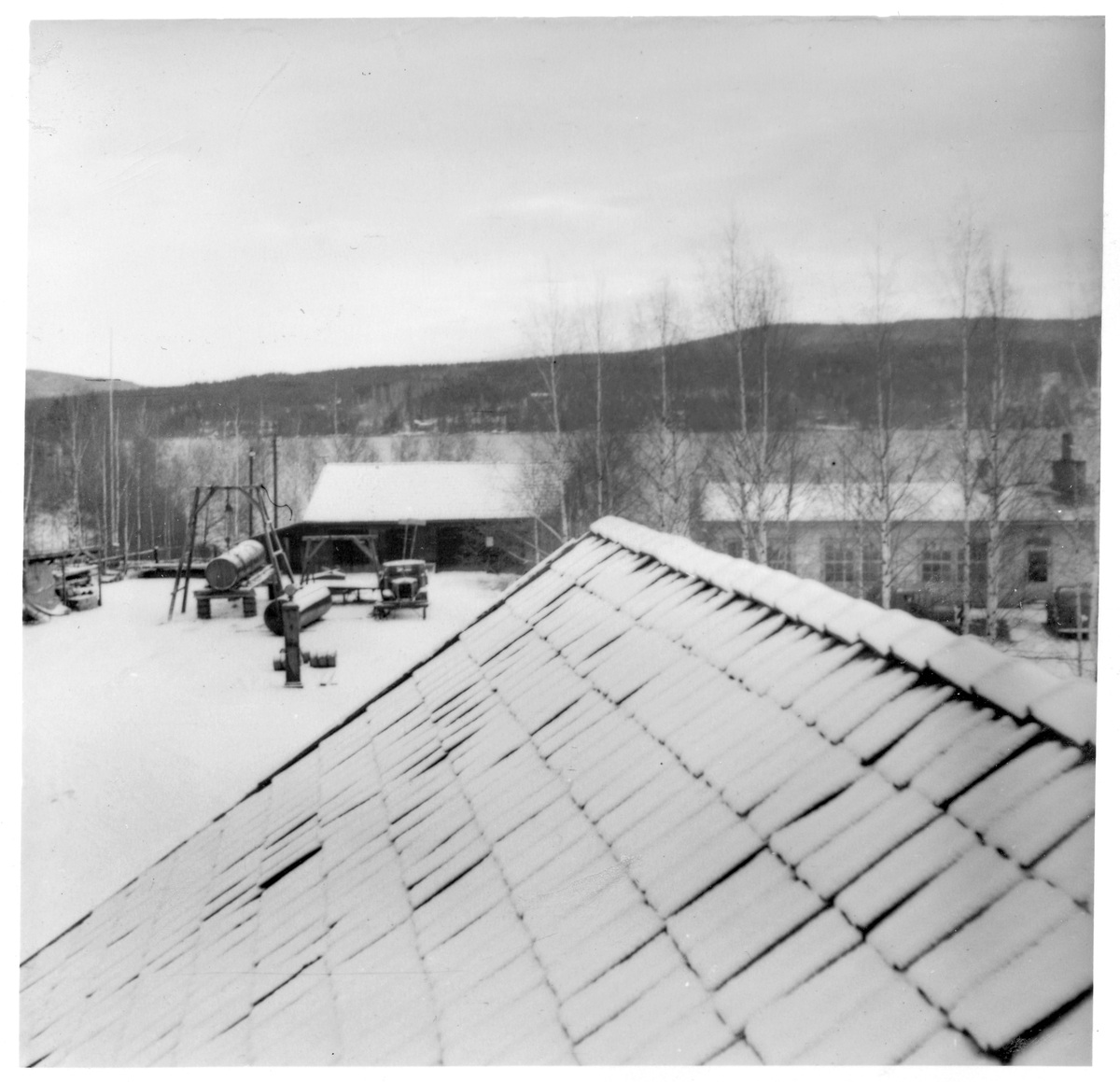 VFW, Depåförråd (Vmo W6). Vy över garageplan. Förrådsbyggnad i bakgrunden. Luttunna på bockar, under vinsch, lastbil. Bensinpump (drivmedelspump).