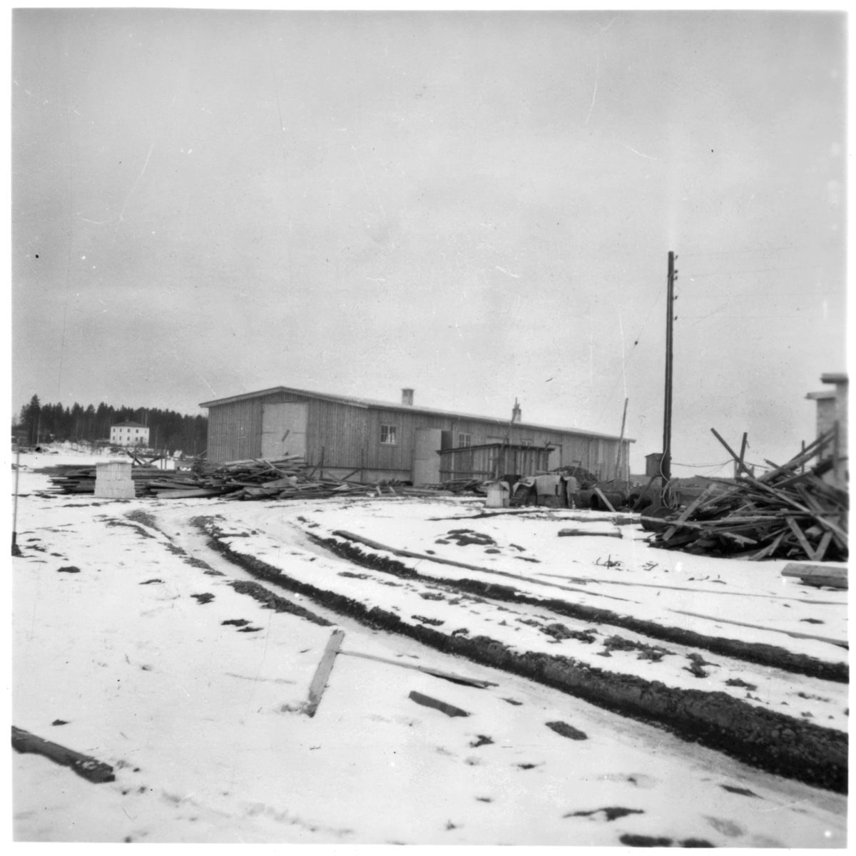 Depåförrådet i Västmanlands län. Förrådsbyggnad. Diverse virke runt byggnaden.