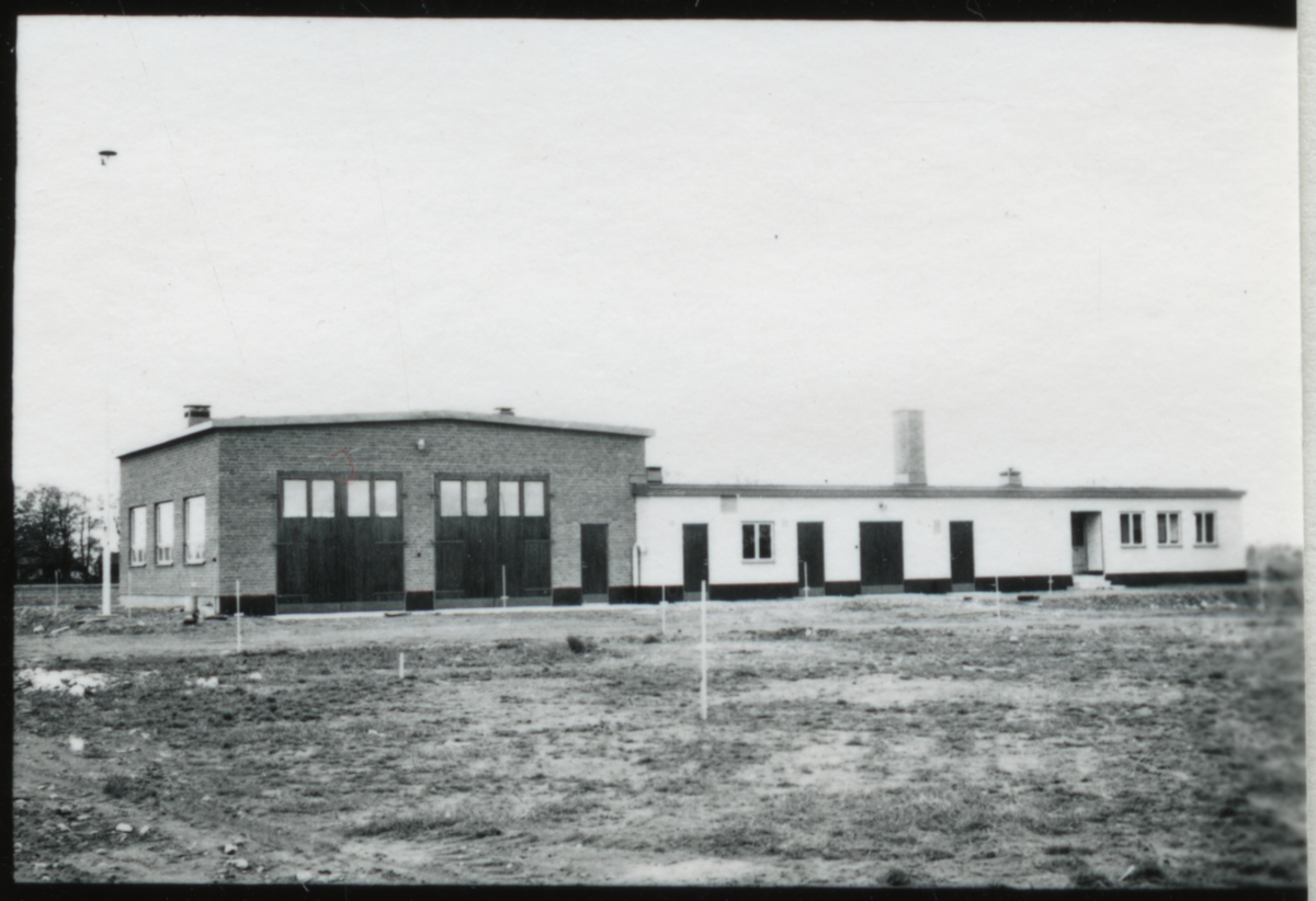Vägstation W5, Åselby. Vägstationens huvudbyggnad, med från vänster verkstad, förråd och kontor. Markberedning av garageplan pågår.