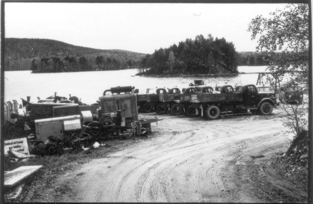 Vägstation W 6, Falun. Uppställning av olika väghållningsfordon och väghållningsmaskiner, nere vid sjön Varpan, bland annat lastbilar, luftkompressorer.