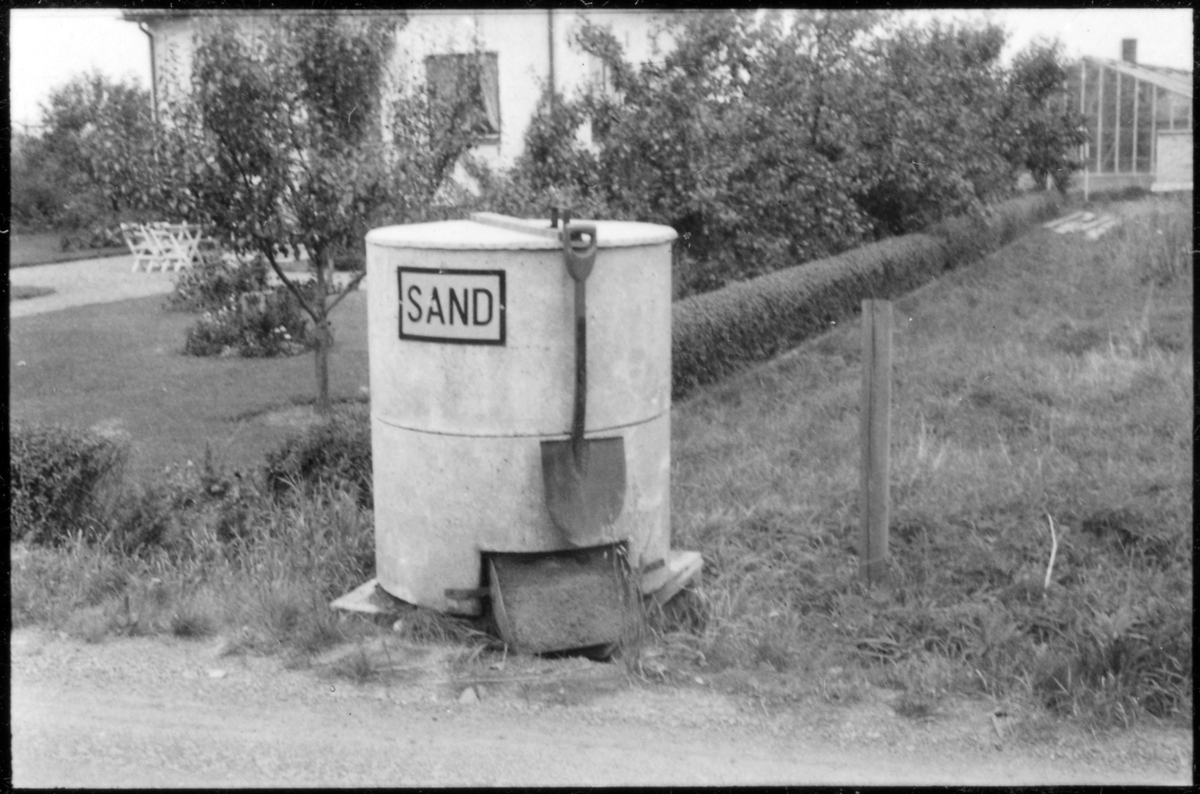 Vägstation P12, Åsaka. Sandlåda, eventuellt av cement. Spade, öppning nertill för hämtning av sanden. Skylt "Sand".
