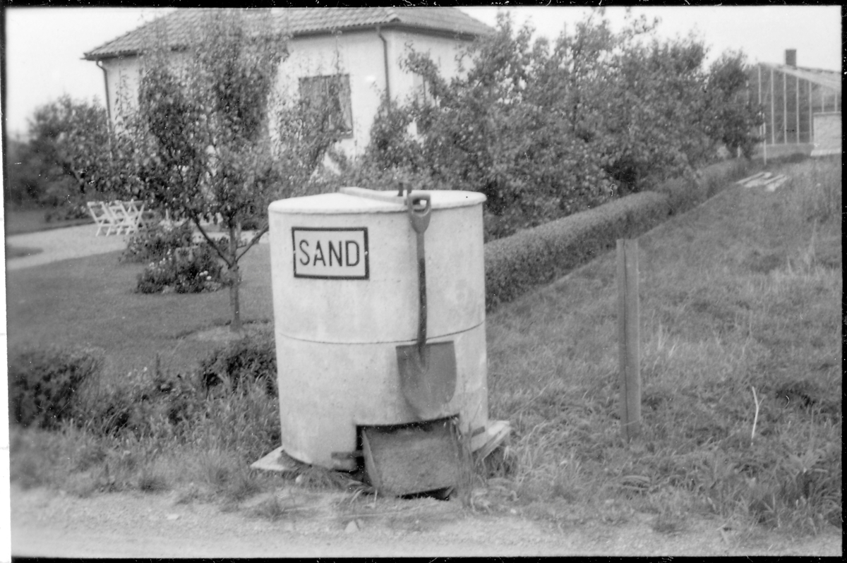 Vägstation P12, Åsaka. Sandlåda, eventuellt av cement. Spade, öppning nertill för hämtning av sanden. Skylt "Sand".