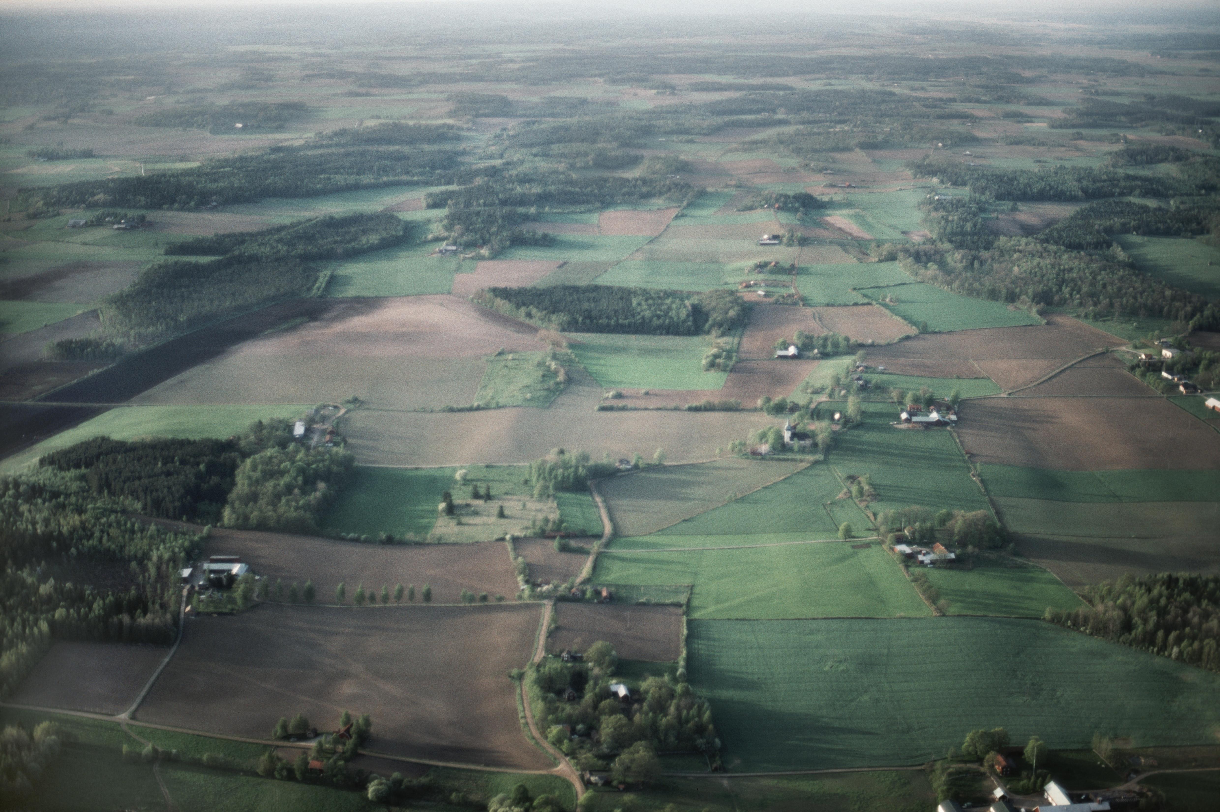 Drumlinområde. Till vänster under bildens mitt Tjugesta gamla tomt RAÄnr Hackvad 34:1, till höger Hackvads kyrka. I bildens övre del socknet Edsberg. Bilden är tagen mot (väderstreck): N