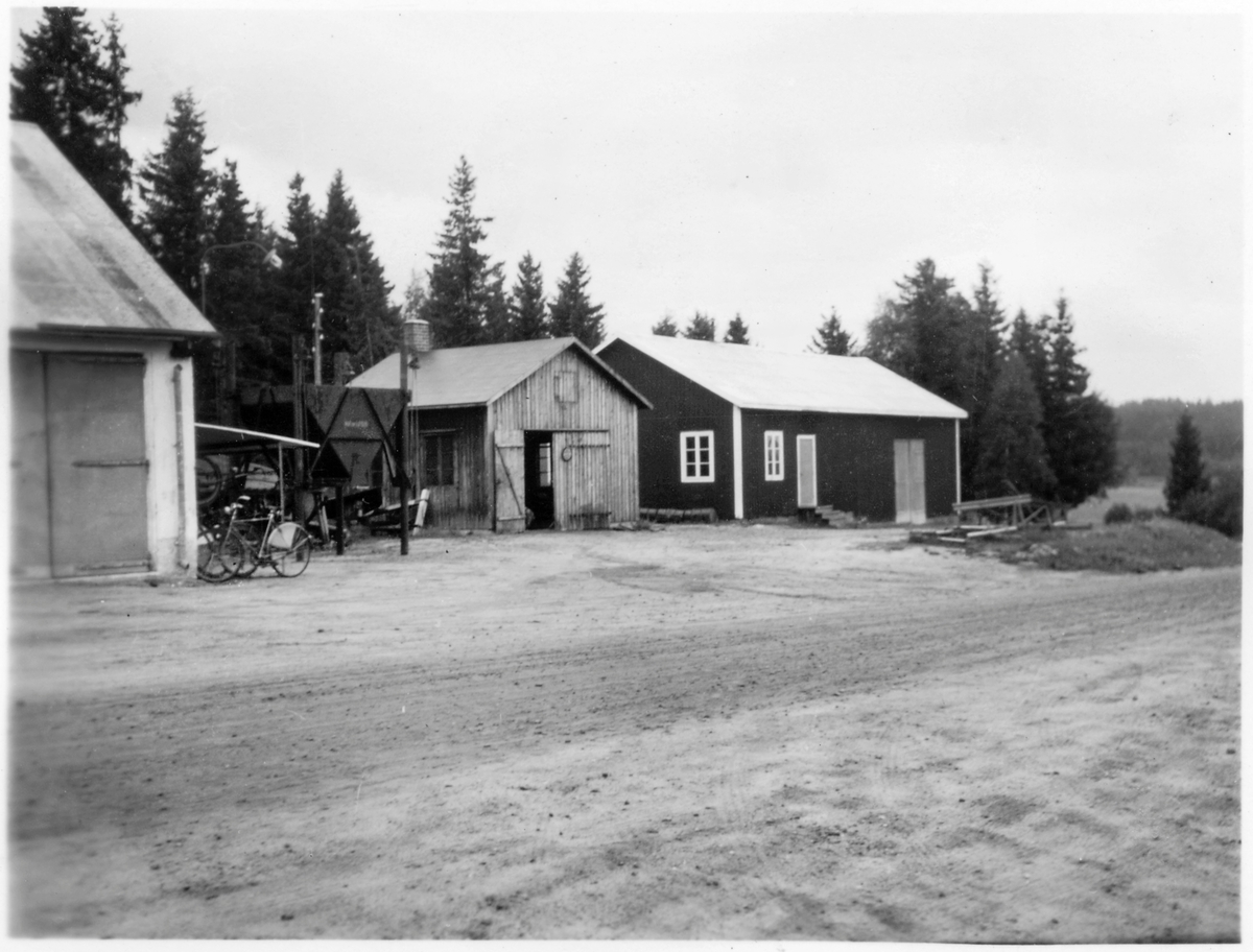 Vägstation Vmo X7, Gnarp. Förrådsbyggnader. Grusficka och cykelställ med cyklar. Invid väg.