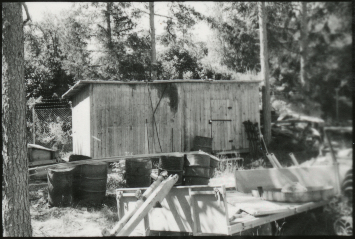 Byggnadsavdelningens förråd, i anslutning till Vmo X8, Ljusdal. Mindre träskjul, skrotupplag, bränslefat