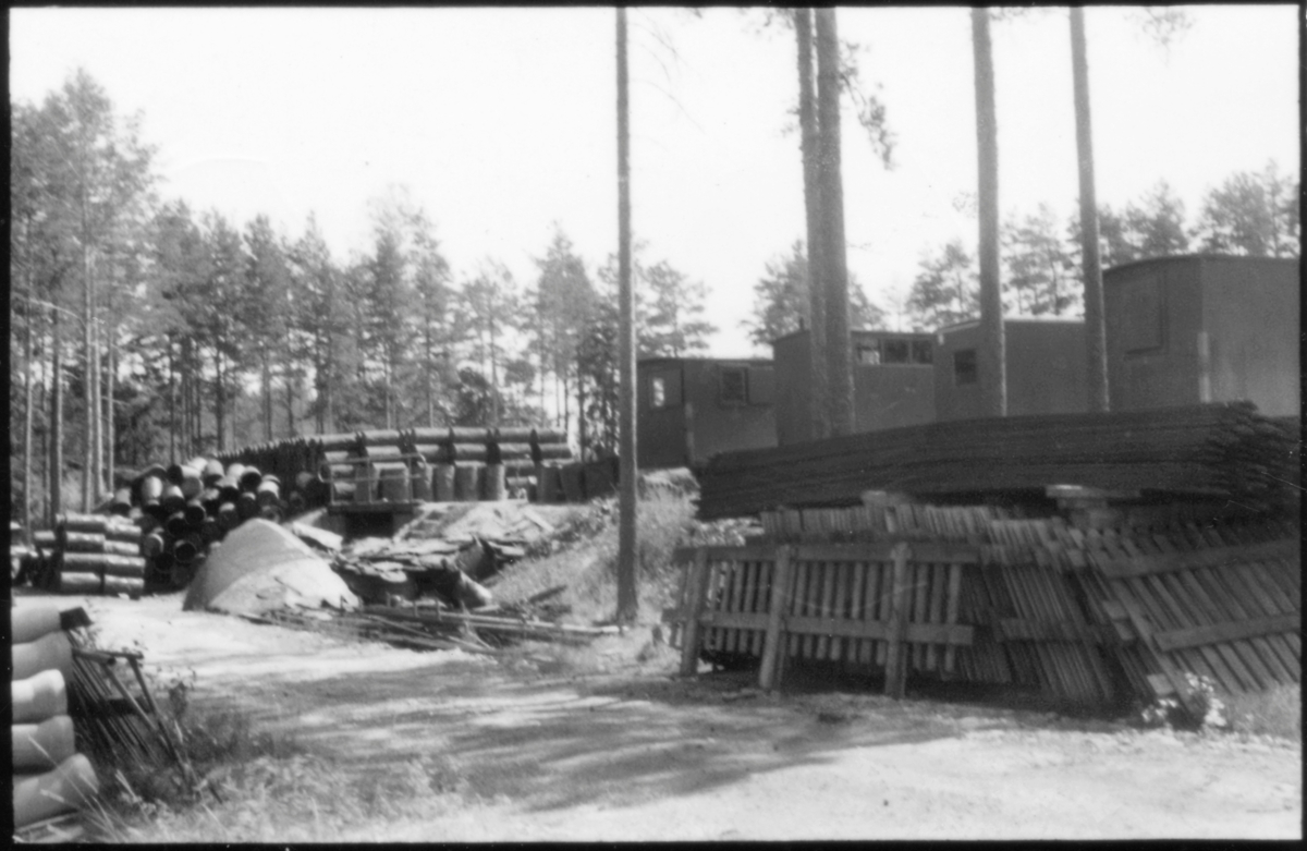 Vägstation Vmo X11, Delsbo. Materialupplag vägtrummor, snöskärmar, manskapsvagnar