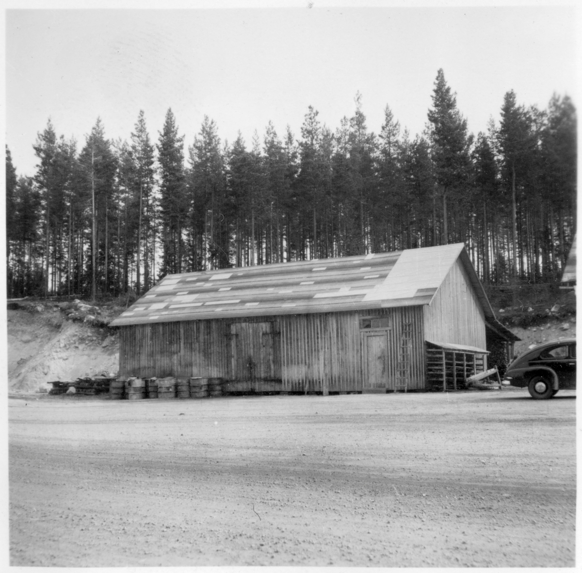 Vägstation Y1, Östavall. Förrådsbyggnad. Upplag av bränslefat. Personbil Volvo PV.