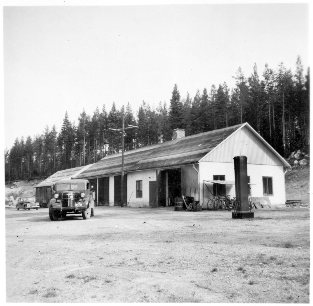 Vägstation Y1, Östavall. Garagebyggnad. I bakgrunden förrådsbyggnad. På garageplan lastbil Volvo. Cykelställ med cyklar vid gaveln av garagebyggnaden. Bensinpump (drivmedelspump). I bakgrunden personbil Volvo PV.