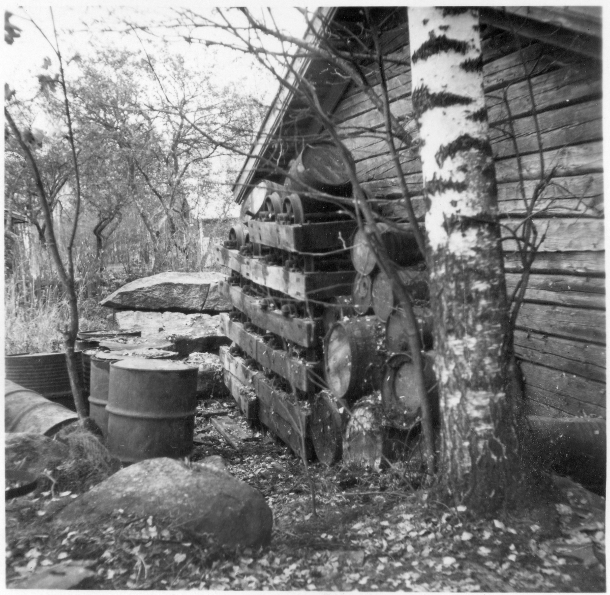 Vägstation Vmo X4, filial Freluga. Förrådsbyggnad, med skrotupplag vid gaveln.