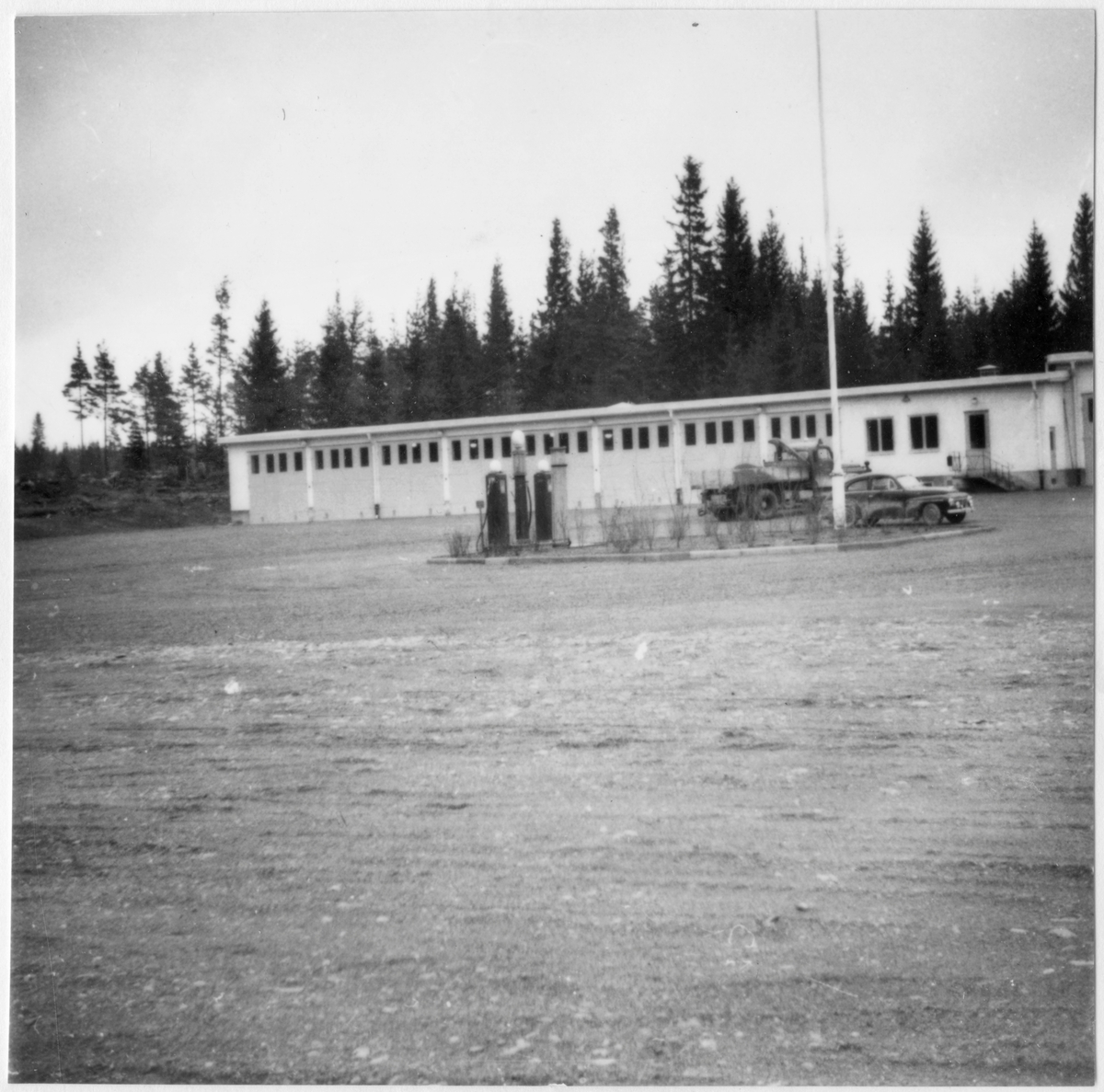 Vägstation G10, Åseda. Vägstationens huvudbyggnad med garagedel och kontorsdel. Verkstadsdelen skymtar till höger. På garageplan lastbil och personbil Volvo PV. Bensinpumpar (drivmedelspumpar), flaggstång.