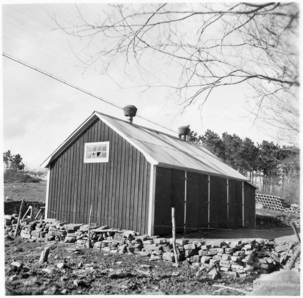 Vägstation H11, Borgholm, filial Kungsgården. Garage- och förrådsbyggnad. Stenmur kring byggnaden. Upplag av cementrör i bakgrunden.