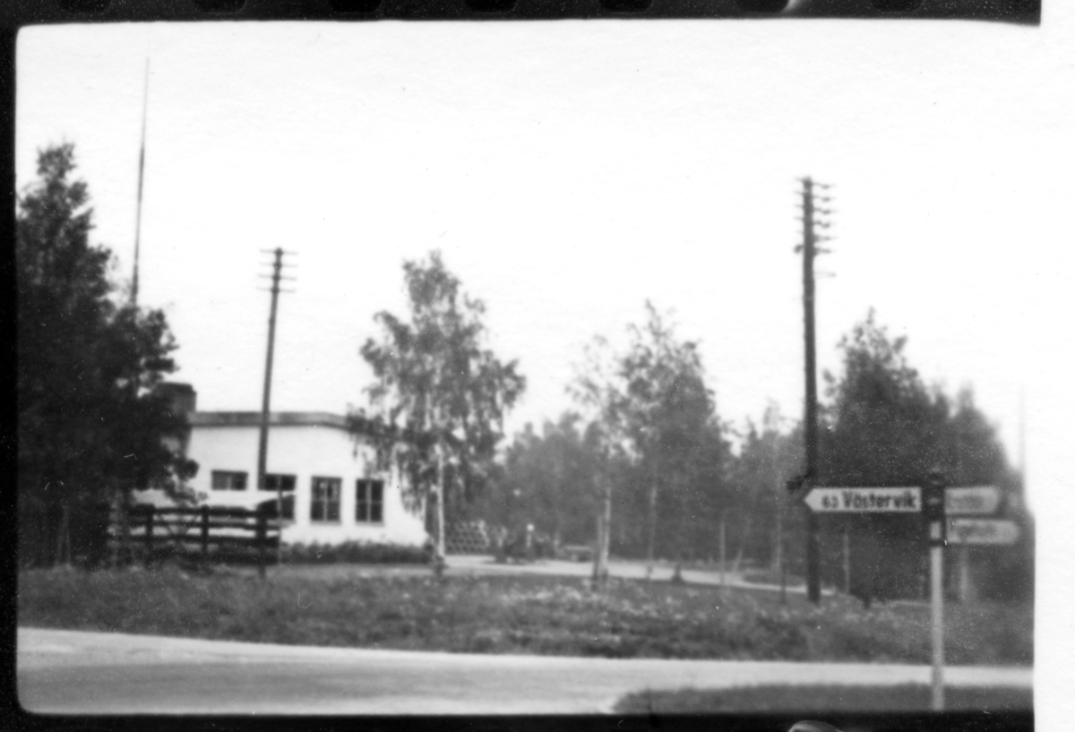 Vägstation H13, Kristdala. Vägstationens huvudbyggnad med verkstadsdelen närmast, sedd från väg utanför området. Vid vägen tre vägvisare på en stolpe, med texter, bland annat "63 Västervik, Kristdala 1".