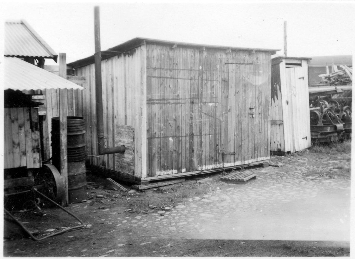 H län, Hamnförrådet i Kalmar. Avvecklades 1946. Översikt med diverse förrådsbyggnader, upplag av diverse material, "skrot". Planen belagd med fältsten (kullersten).