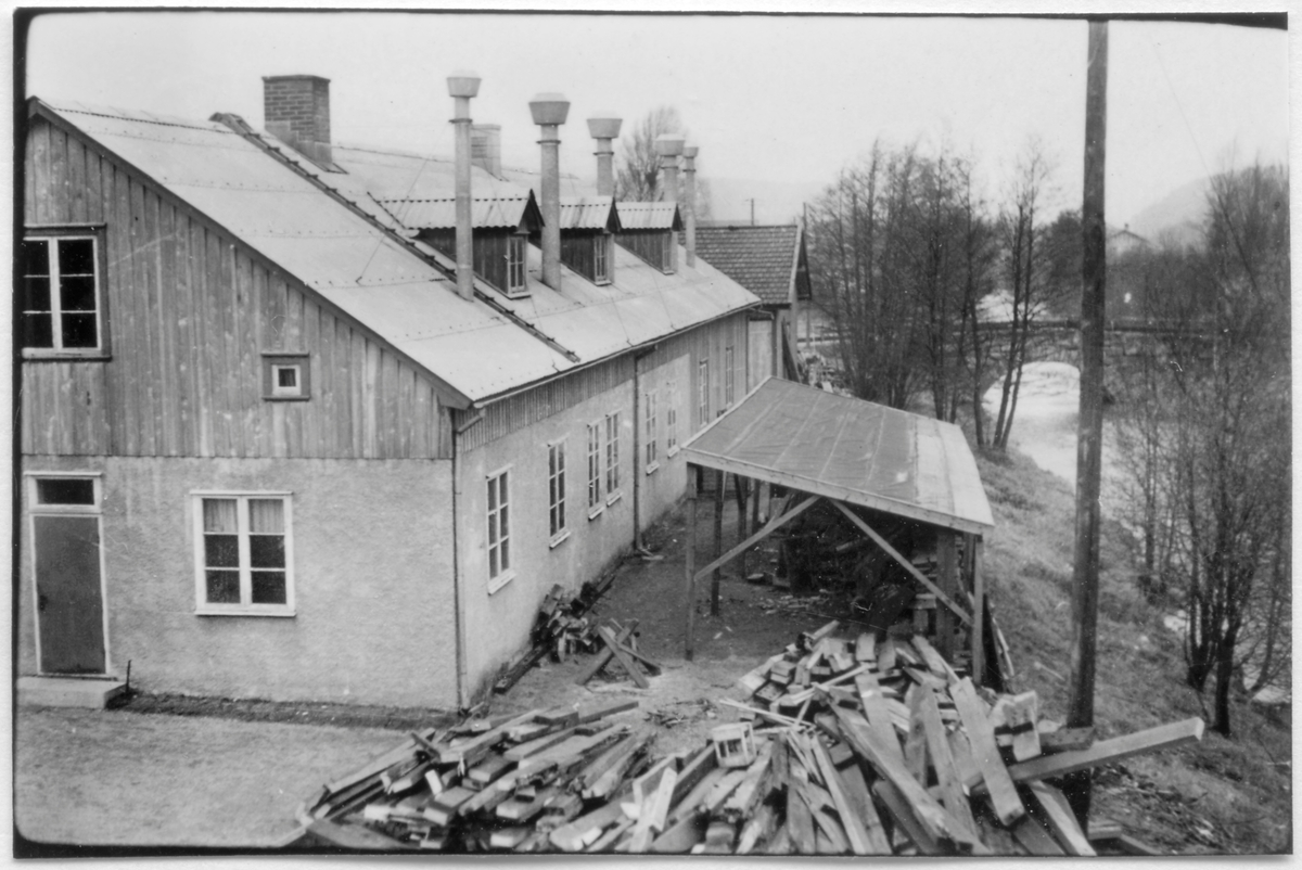 Vägstation O7, Tanumshede, filial Skee. Garage- och förrådsbyggnad, baksidan. Diverse virkesupplag. I bakgrunden skymtar en stenbro över Vättlandsån (troligen RAÄ, Skee socken nr 820).
