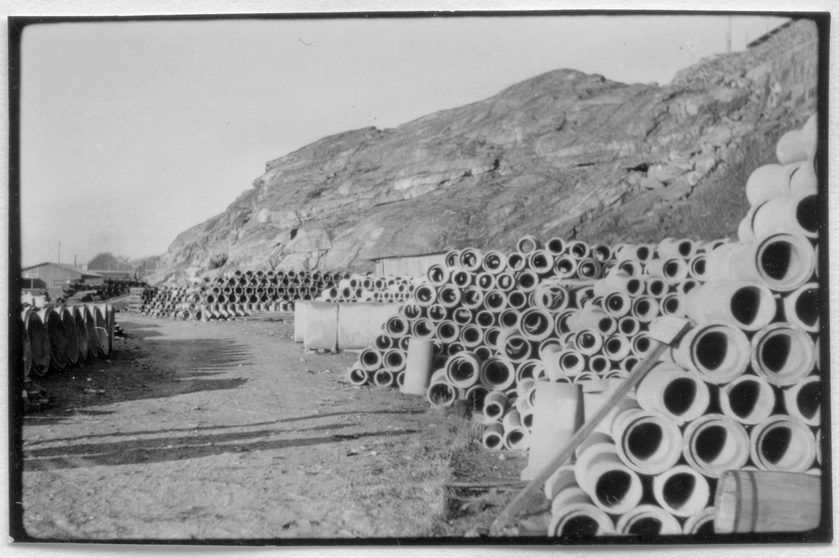 VFO, Färjevarvet, Fridhem. Strandparti med upplag av cementringar. Förrådsbyggnad i bakgrunden.