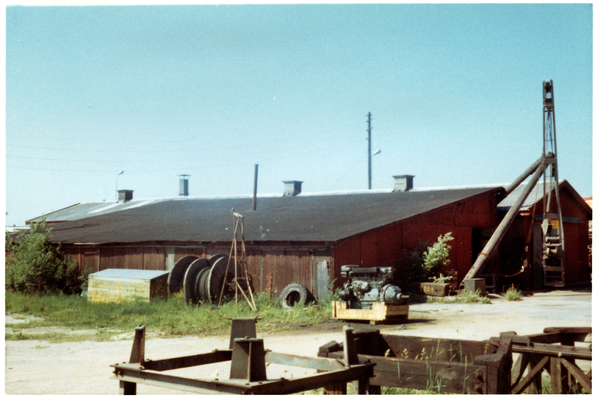 VFO, Färjevarvet, Fridhem. Förrådsbyggnad, vinsch (lyftkran). Motor till färja på lastpall.