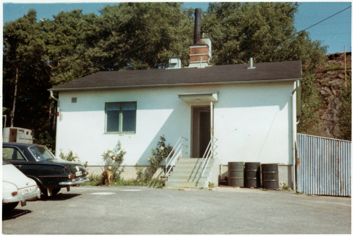 VFO, Färjevarvet, Fridhem. Byggnad, troligen kontorsbyggnad. Personbilar till vänster.