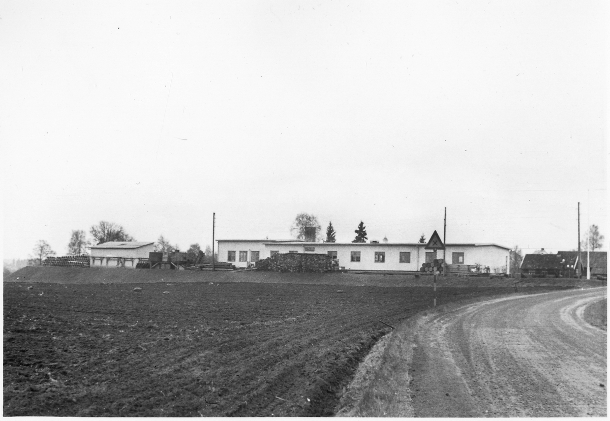Vägstation P1, Hid. Vägstationens huvudbyggnad med från höger garage, kontor, verkstad (baksidan). Åkermark strax bakom byggnaden. Förrådsbyggnad till vänster. Upplag av virke, cementrör, bränslefat. Väg till höger med vägmärke "Korsväg".