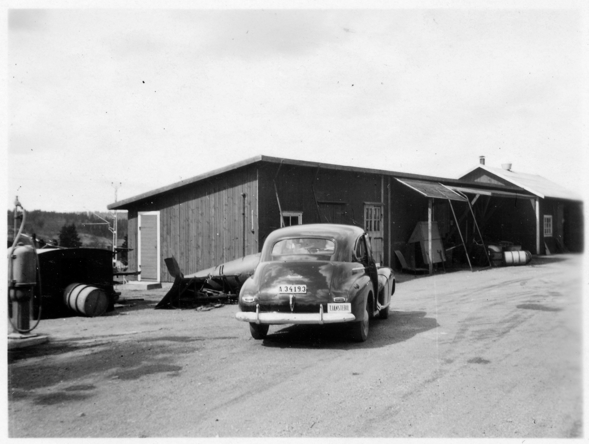 Vägstation F7, Tenhult. Förrådsbyggnader med diverse materialupplag runt omkring. Bensinpump (drivmedelspump), bränslefat, spetsplog. Personbil A34193, med skylten "Tjänstebil".