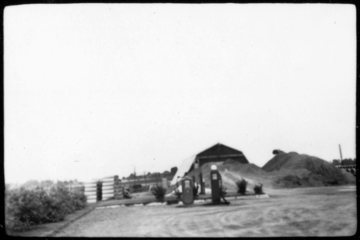 Vägstation Vmo E3, Boxholm, filial Ödeshög. Garageplan med sand- och saltlada i bakgrunden. Bensinpumpar (drivmedelspumpar) bland annat troligtvis Ljungmans pump (till vänster) Star, 1950.