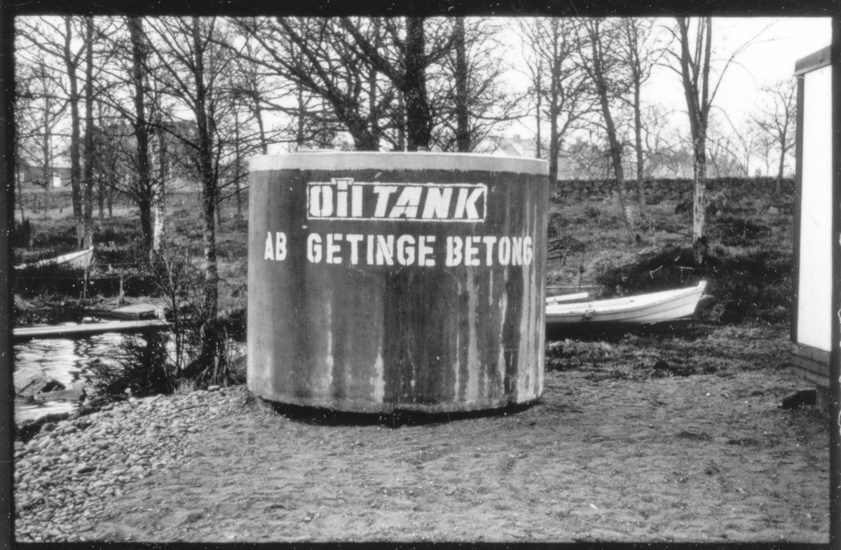Vägstation F5, Unnaryd, färjeläget Bolmsö. Drivmedelscistern med texten "Oiltank. AB Getinge betong".