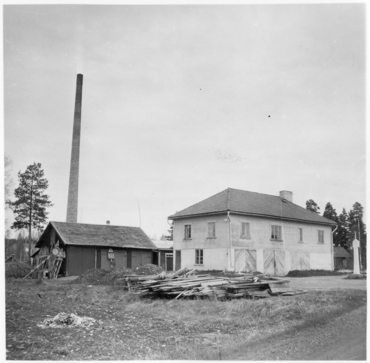 Vägstation Y16, Hoting. Garage- och kontorsbyggnad. Förrådsbyggnad i bakgrunden. Bensinpump (drivmedelspump). Vägmärken lutade mot förrådsbyggnaden. Hög industriskorsten i bakgrunden. Invid väg.