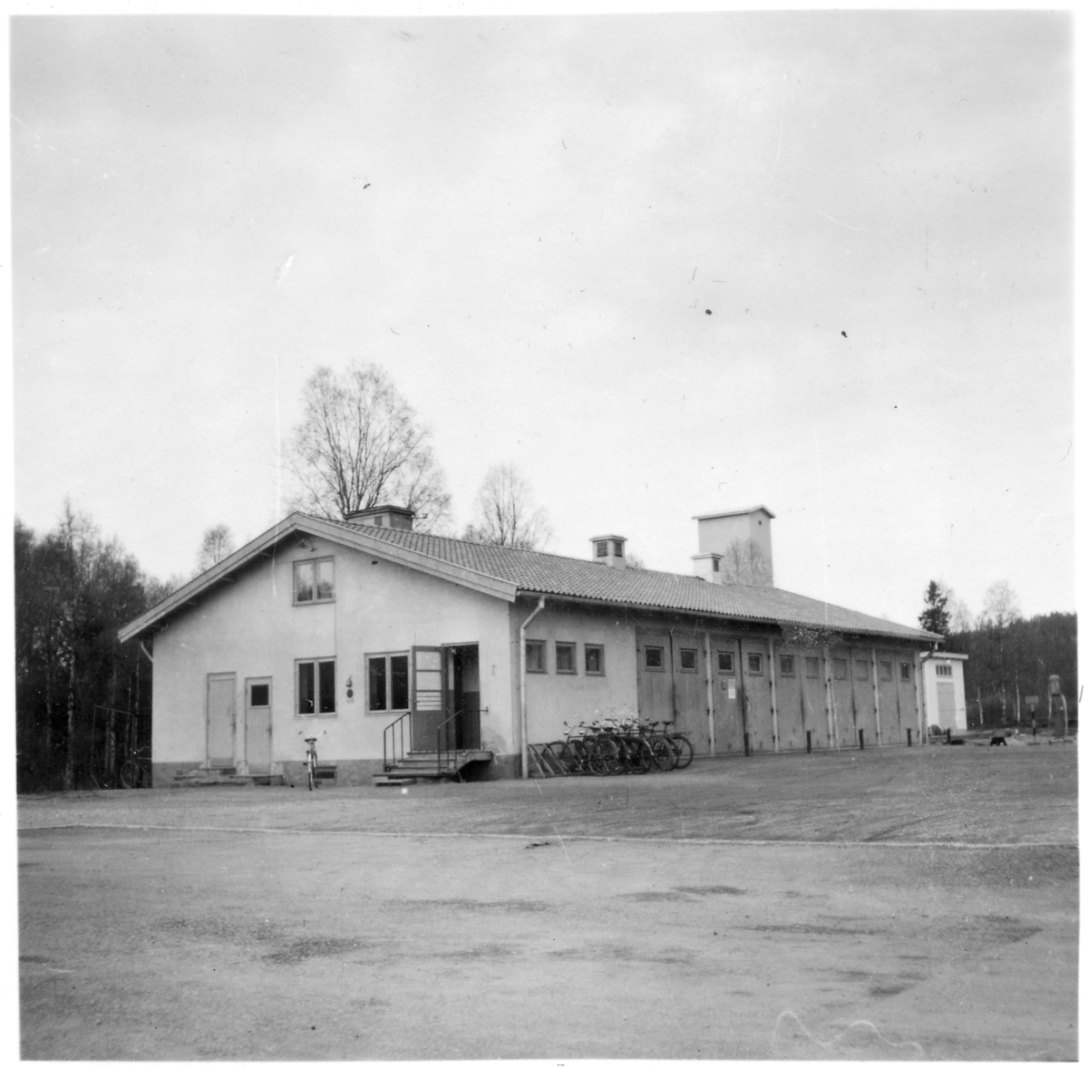 Vägstation Y16, Hoting. Vägstationens huvudbyggnad med kontor, förråd och garage. Ingång på gaveln till förråd och kontor. Cykelställ med cyklar vid väggen.