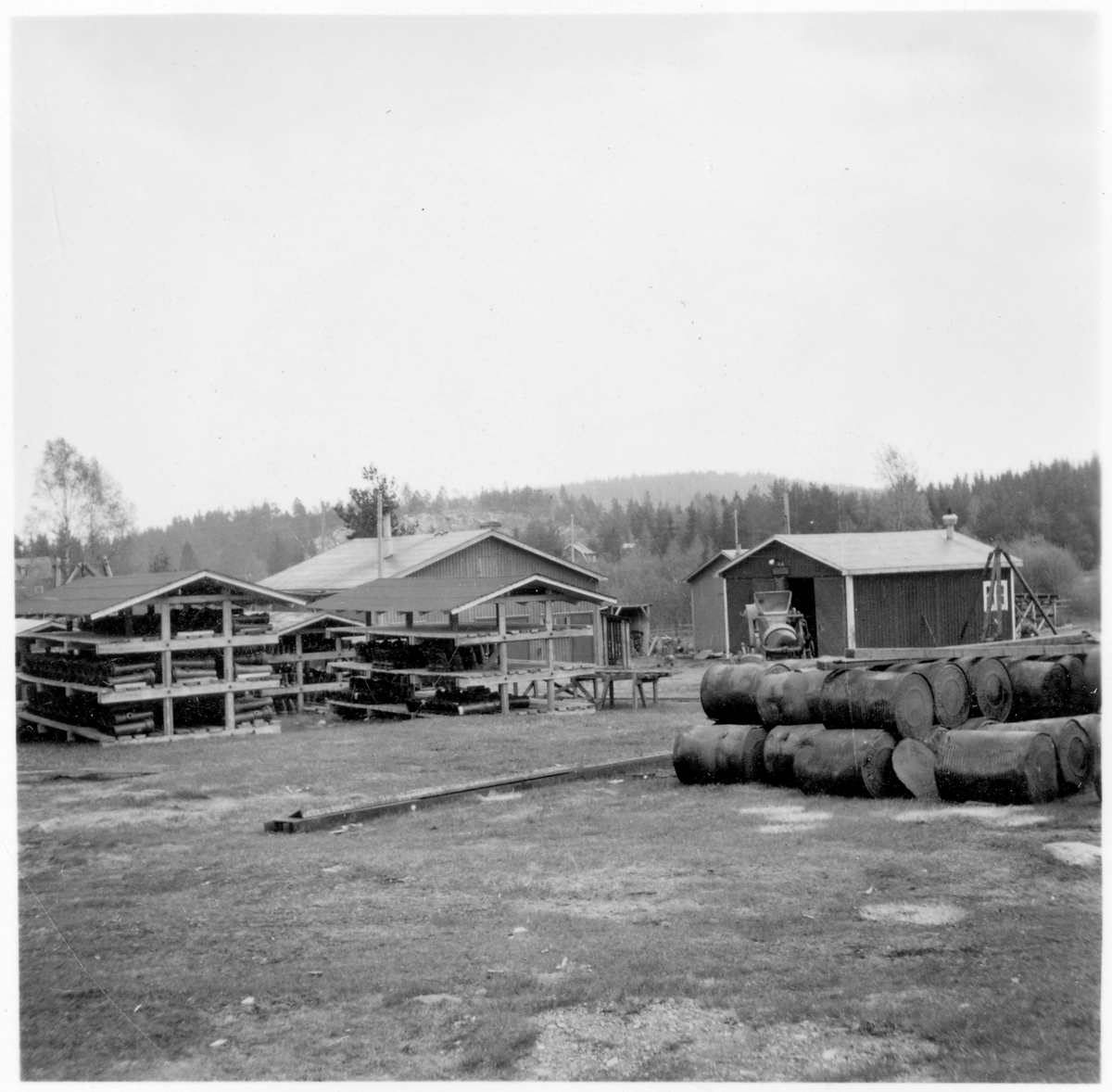 Y län. Före detta hamnförrådet. Förrådsbyggnader. Upplag av diverse material runt byggnaderna, bland annat muffrör, bränslefat, cement- och betongblandare, sten och stubbrytare.
