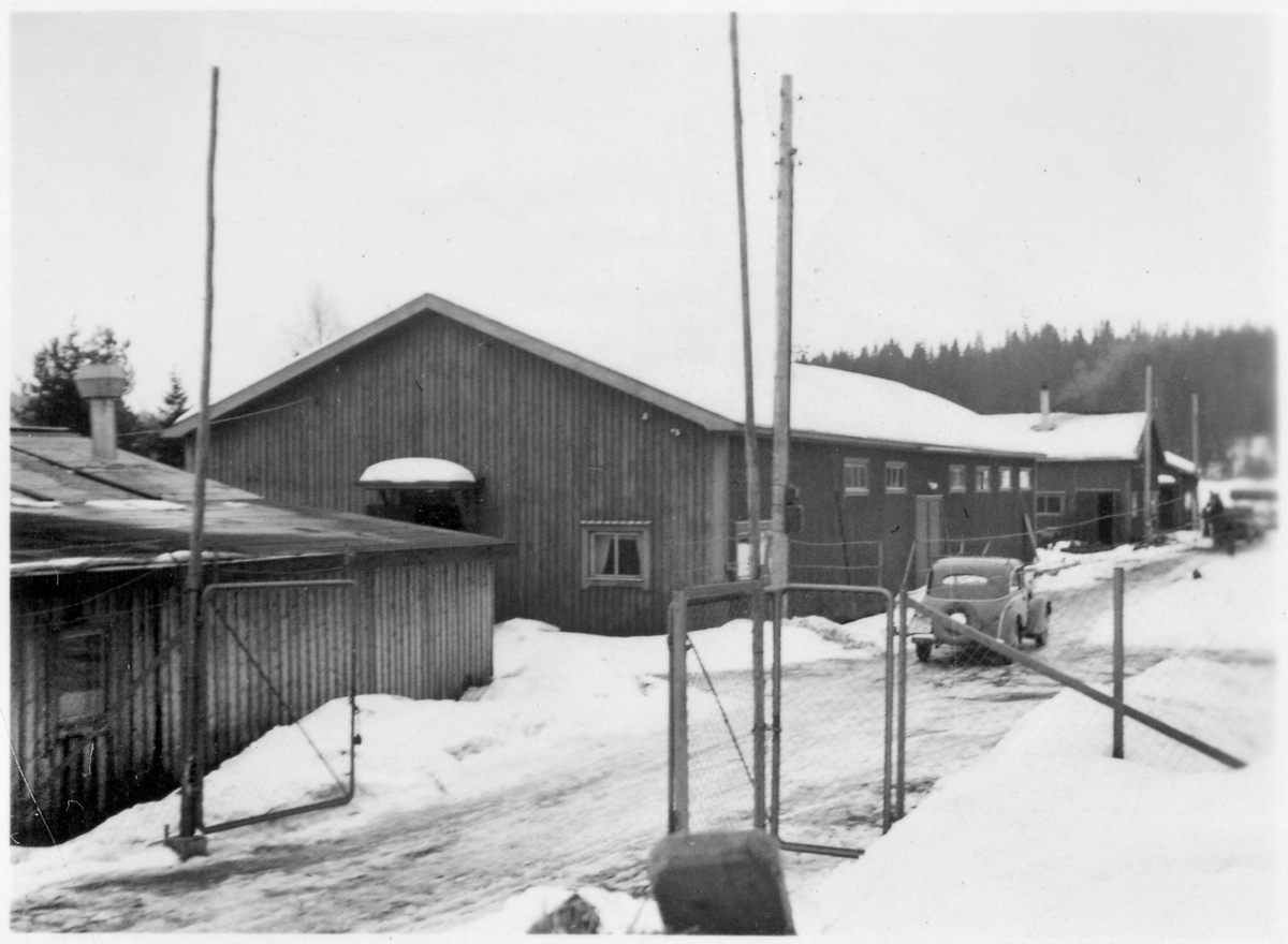 Y län. Före detta hamnförrådet. Infarten till området (med grind) med olika förrådsbyggnader. Personbil (vinterbild).