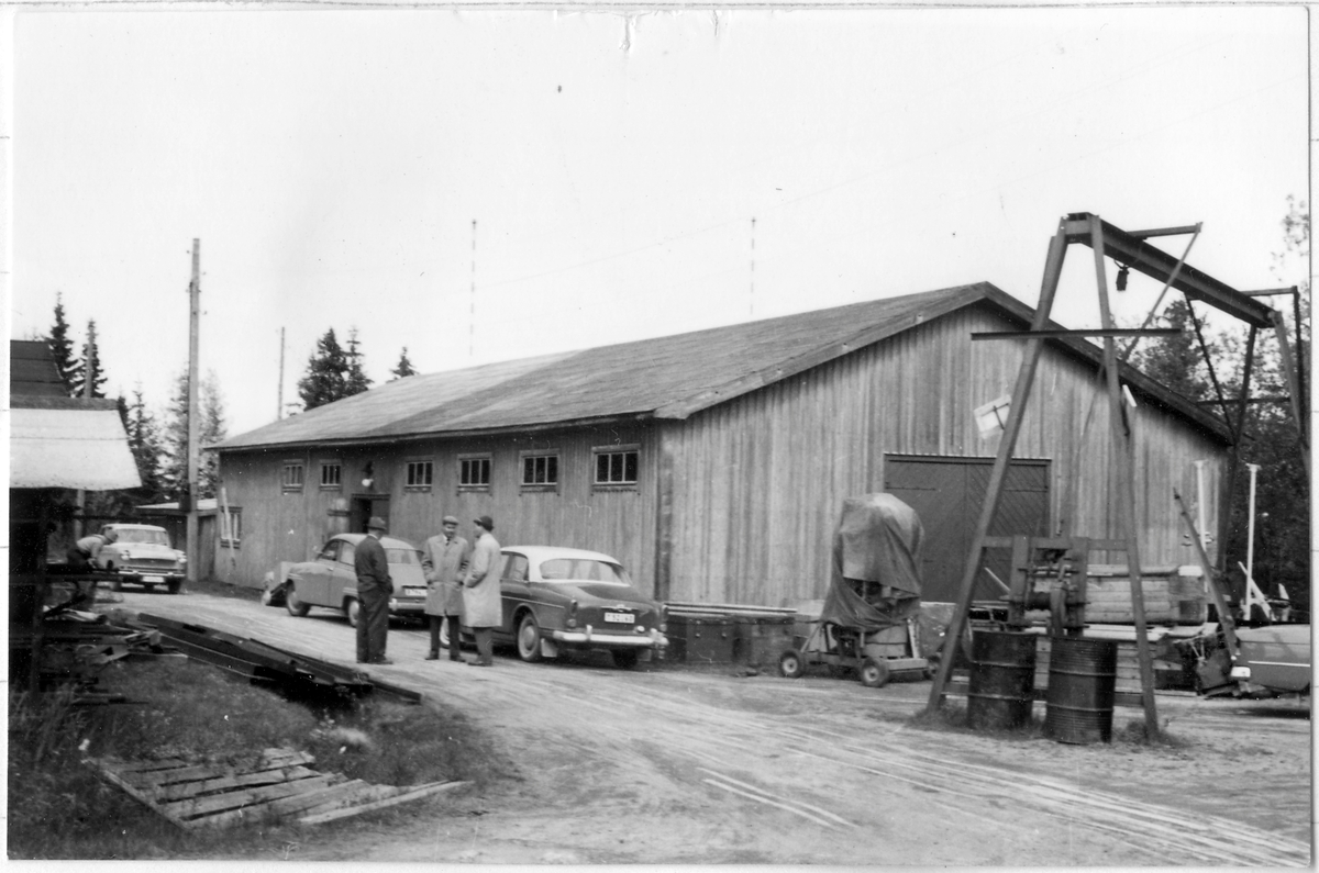 Vägförvaltningen i Västernorrlands län, VFY, Byggnadsförrådet. Förrådsbyggnad. Bock med handdriven wirevinsch. Personbilar, bland annat Saab, Volvo Amazon framför byggnaden, manspersoner vid bilarna.