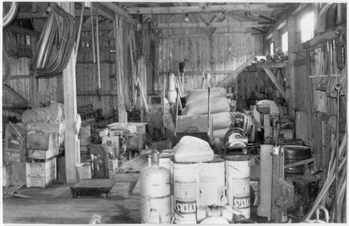 Vägförvaltningen i Västernorrlands län, VFY, Byggnadsförrådet. Interiör från förrådsbyggnad. Olika handredskap såsom spadar, bågsågar, kratta. Tjärpapper i rulle, säckvåg med mera.