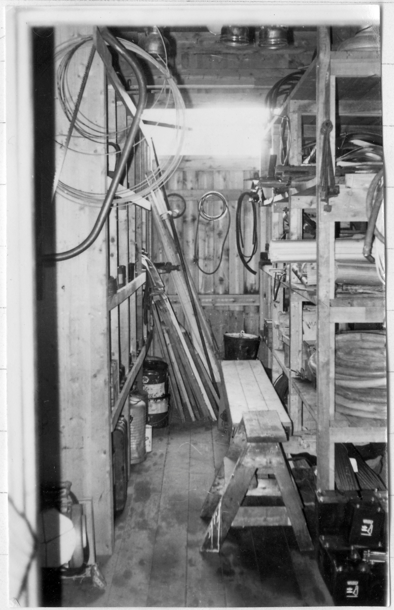 Vägförvaltningen i Västernorrlands län, VFY, Byggnadsförrådet. Interiör från förrådsbyggnad. Hyllsystem med olika redskap, såsom bågsåg, bränsledunkar, slangar, brännjärn, troligen med text VoV.